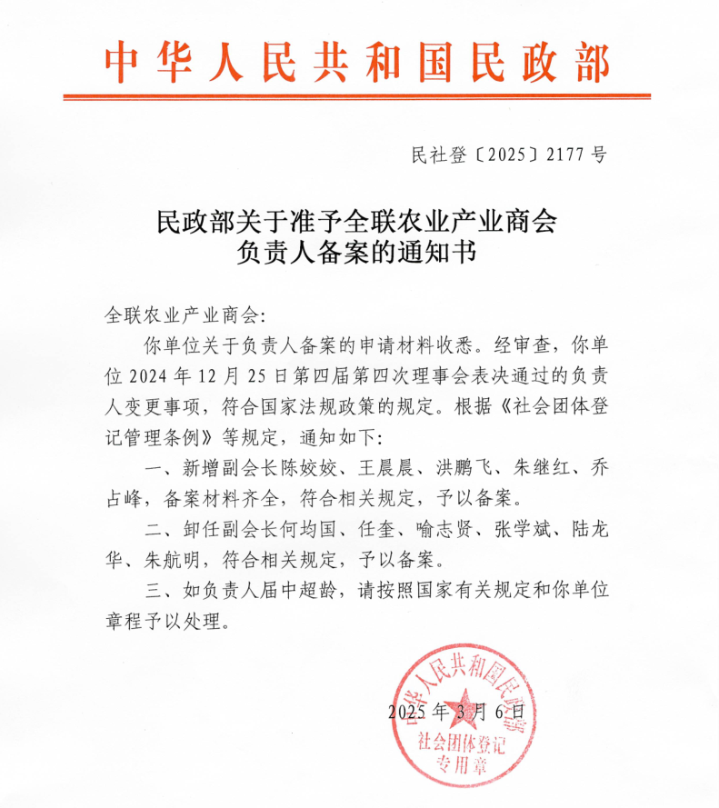在大會正式召開之前,全國工商聯(lián)農(nóng)業(yè)產(chǎn)業(yè)商會還召開了第四屆第四次理事會、第七次常務(wù)理事會暨第九次會長辦公會。會議匯報(bào)了2024年商會工作情況及2025年工作計(jì)劃,并審議通過了新增及調(diào)整副會長人員名單,分支機(jī)構(gòu)成立的申請和論壇活動管理制度等事項(xiàng),并傳達(dá)全國工商聯(lián)沈瑩書記一行調(diào)研商會時(shí)的講話要點(diǎn)。大莊園集團(tuán)總裁陳姣姣當(dāng)選全國工商聯(lián)農(nóng)業(yè)產(chǎn)業(yè)商會副會長。